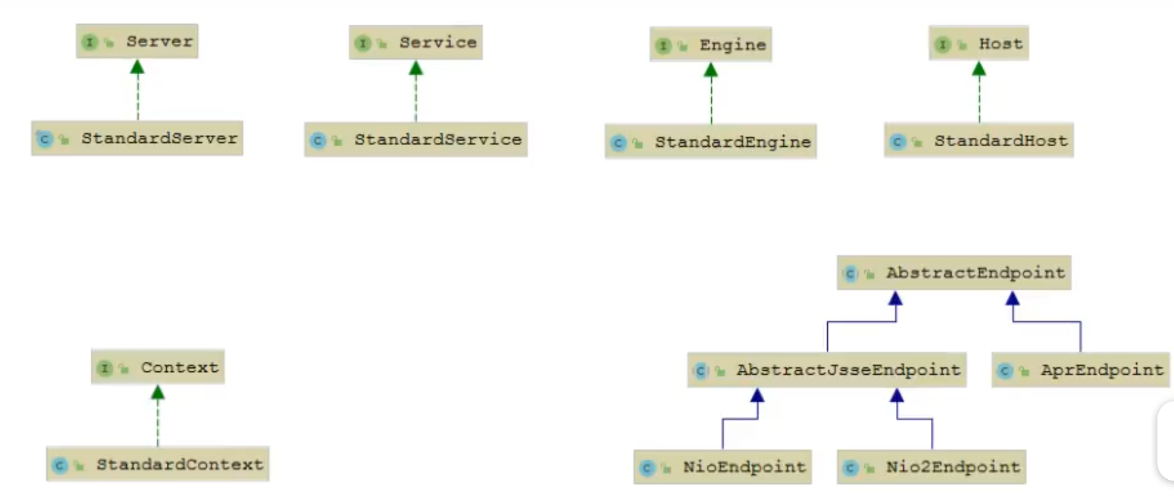 其中,EndPoint 组件,没有对应的 EndPoint 接口,而是使用AbstractEndPoint抽象类,该抽象类下有三个实现类:NioEndPoint、Nio2EndPoint、AprEndPoint。这三个实现类,对应着Coyote链接器支持的三种IO模型:NIO、NIO2(AIO)、APR。(Tomcat 8.5版默认采用是NioEndPoint)