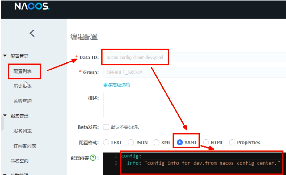 active: dev那么此时,服务启动之后,拉取的配置是namespace 的id 为 3c5e51ab-9904-4485-884a-5bfbc1285910 即dev 的命名空间,Group 为 DEV_GROUP 下的,Data id 为 dev 环境的配置文件。